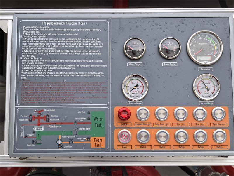 Pannello di controllo: Integra tachimetro, vacuometro, manometro, indicatore del livello di schiuma, indicatore del livello dell'acqua, istruzioni per l'uso, schema delle tubazioni, spia della presa di forza, spia del vano attrezzi, interruttore della pompa del vuoto, interruttore della luce esterna, interruttore di alimentazione principale, controllo elettronico dell'acceleratore, interruttore di arresto di emergenza e altri pulsanti.